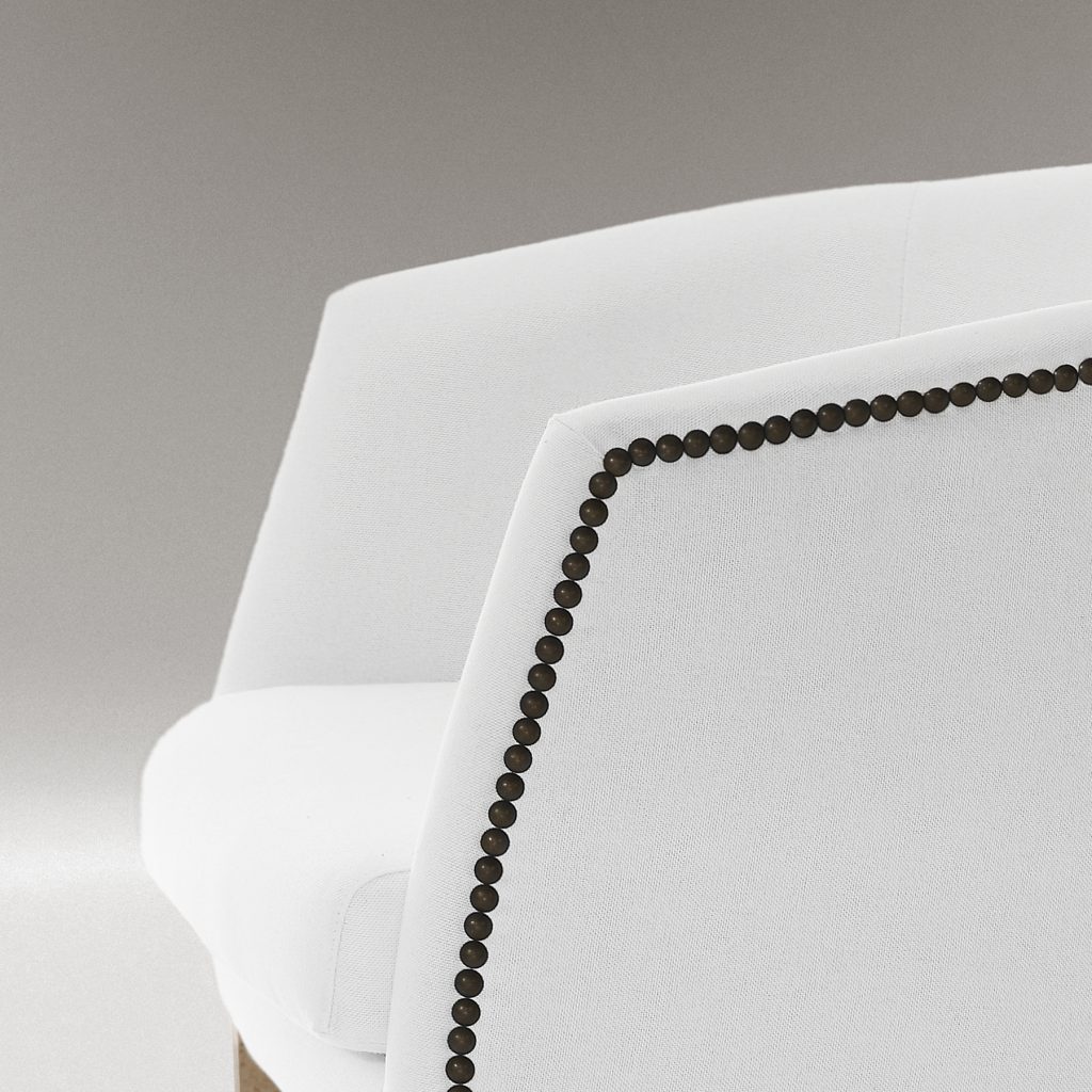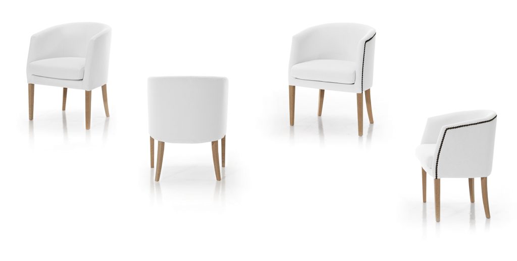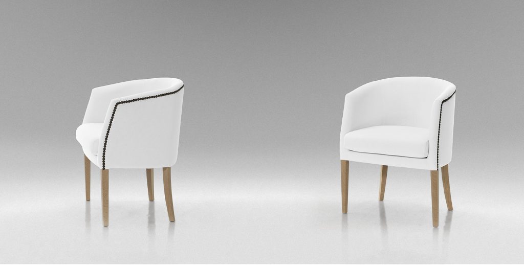 Gerona es una butaca de líneas depuradas y respaldo envolvente que combina ligereza visual y carácter artesanal. Su silueta limpia se equilibra con la delicada línea de tachuelas, colocadas una a una, que recorren el perfil lateral aportando identidad sin exceso.